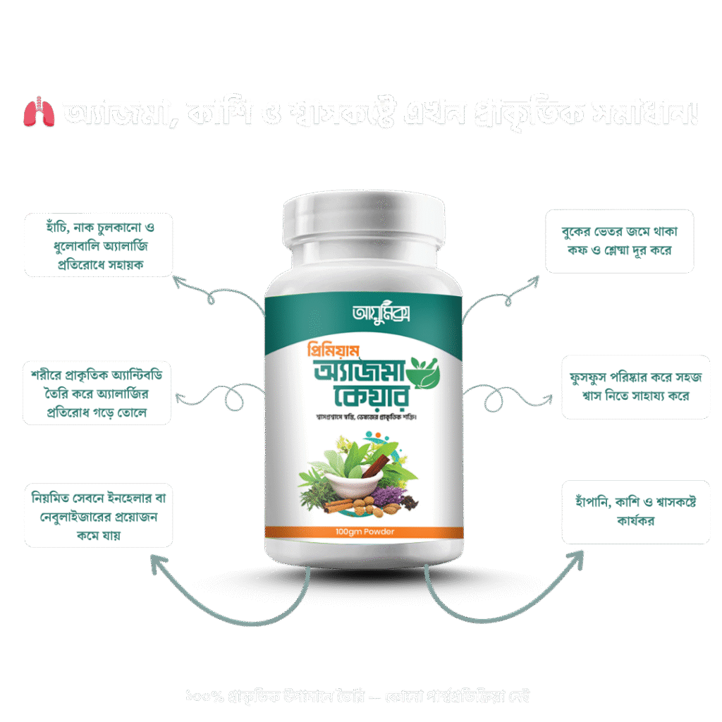 অ্যাজমা কেয়ার — প্রাকৃতিক ও ভেষজ সাপোর্ট, ইনহেলার নির্ভরতা কমাতে সহায়ক। সম্পূর্ণ নিরাপদ ও পার্শ্বপ্রতিক্রিয়ামুক্ত।