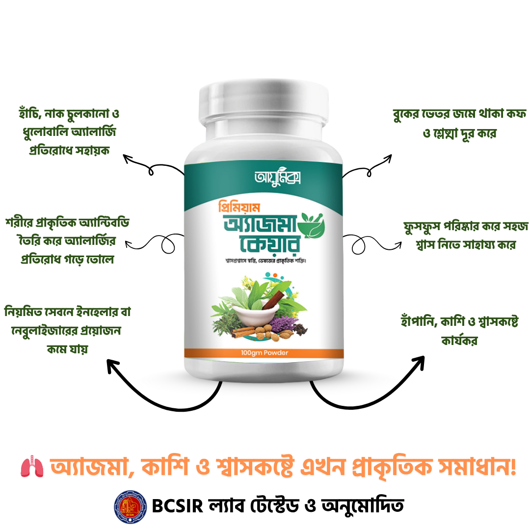 অ্যাজমা কেয়ার — প্রাকৃতিক ও ভেষজ সাপোর্ট, ইনহেলার নির্ভরতা কমাতে সহায়ক। সম্পূর্ণ নিরাপদ ও পার্শ্বপ্রতিক্রিয়ামুক্ত।